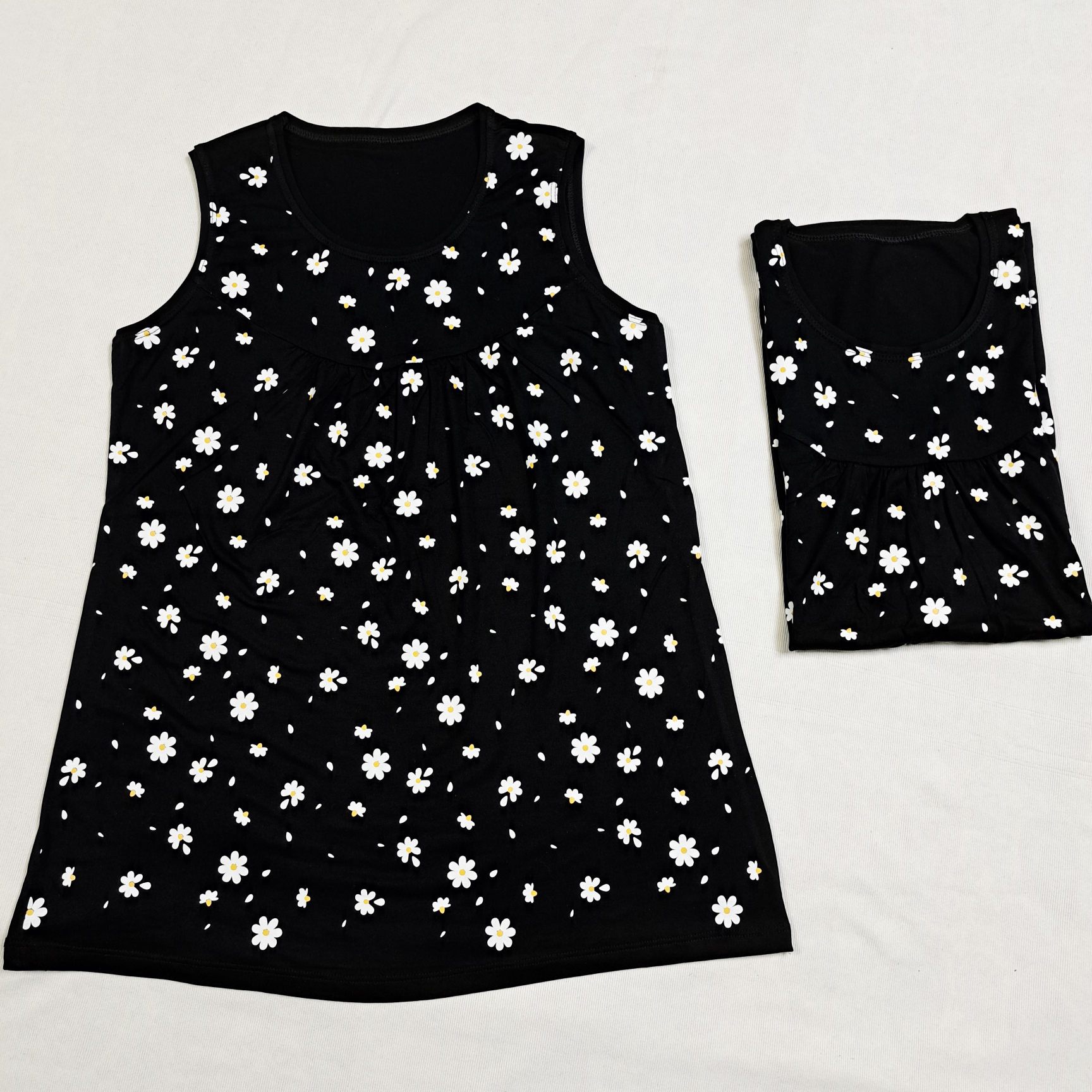تاپ زنانه ویسکوز طرح بابونه با قواره آزاد؛ انتخابی مناسب برای روزهای گرم. پارچه نرم و تنفسپذیر همراه با دوخت تمیز و طرح گلهای ریز و جذاب.
